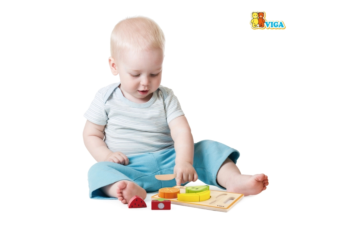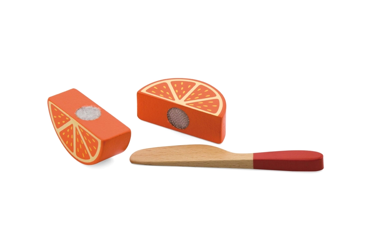 Frugten, der holdes sammen af velcro, giver en autentisk modstand og lyd ved “skæring”. Børn øver sikker brug af kniv og forbedrer koordinationen.