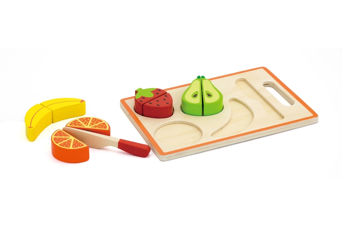 Sættet indeholder skærebræt, trækniv og forskellige stykker farverig frugt, der ligger godt i små børnehænder. Den robuste trækonstruktion og glatte kanter sikrer lang holdbarhed og sikker leg.