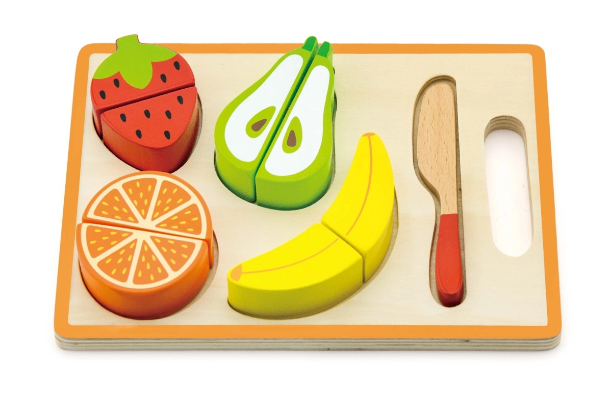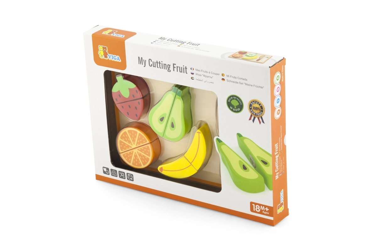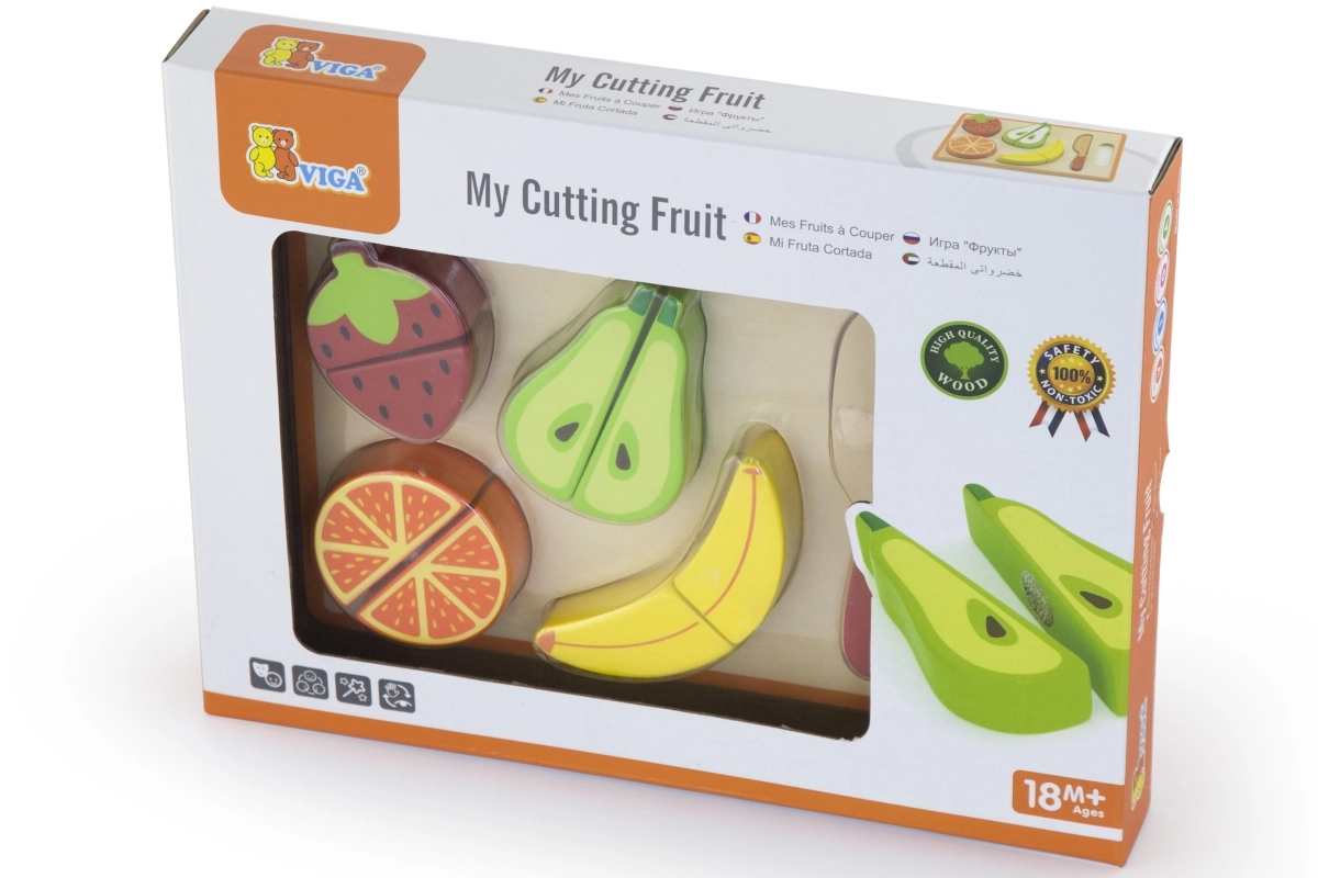 Dette kvalitets trælegetøj giver sikker rolleleg i køkkenet: de enkelte frugtstykker holdes sammen med velcro, så børn igen og igen kan “skære” dem og sætte dem sammen. Det realistiske design hjælper børn med at lære former og farver, træne greb og koordination og udvikle fantasi gennem kokkeleg.