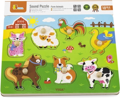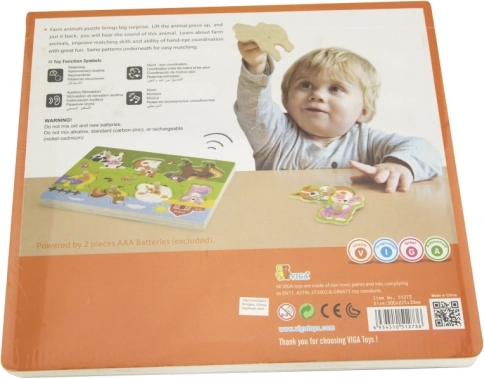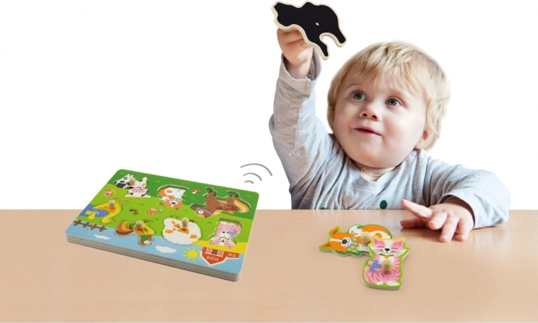 Træpuslespil med dyr med lyd. Når det rigtige dyr placeres, afspilles den lyd, dyret laver. Mål på pladen ca. 30 x 22,5 x 2 cm. Strømforsyning 2 x AAA-batterier (medfølger ikke). Pakkens mål ca. 30 x 27 x 2 cm. Alder 18 m+.