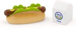 Dette kvalitets træsæt fra VIGA giver børn realistisk køkkenleg. Hotdog med brød, salat og sennep sammen med “mælkekarton” styrker kreativiteten og lærer børn grundlæggende social leg. Takket være den solide trækonstruktion er sættet ideelt til daglig leg.