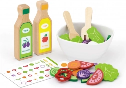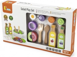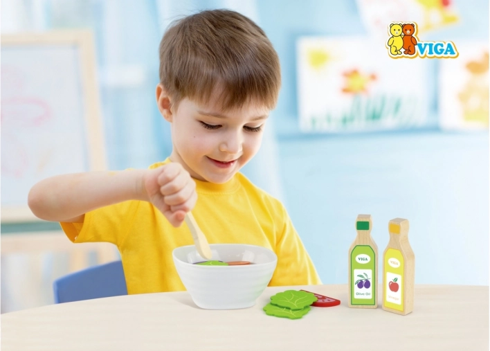 Dette kvalitets træsalatsæt bringer realistisk køkkensjov til børn. Takket være det rige indhold kan de små kokke lave deres egen salat, blande ingredienser i skålen og servere med bestik. Legen understøtter sunde vaner og lærer naturligt at genkende forskellige slags grøntsager.