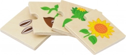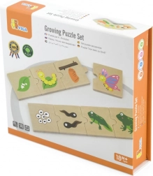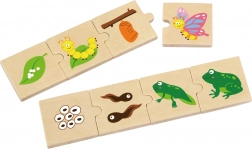 Dette sæt “voksende” træpuslespil lærer børn at forstå livscyklusser hos både dyr og planter – fra frø eller æg til voksenstadiet. Hvert motiv består af en rækkefølge af brikker, der logisk passer sammen og dermed naturligt træner finmotorik, forståelse for sammenhænge og øje–hånd‑koordination.