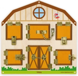 Denne kvalitets trælegeplade i form af et lille hus tilbyder flere døre med forskellige typer låse – kroge, hasper, kæder eller skydelåse. Ved hver åbning venter en lille overraskelse i form af illustrerede dyr, hvilket understøtter nysgerrighed, koncentration og øje–hånd-koordination.