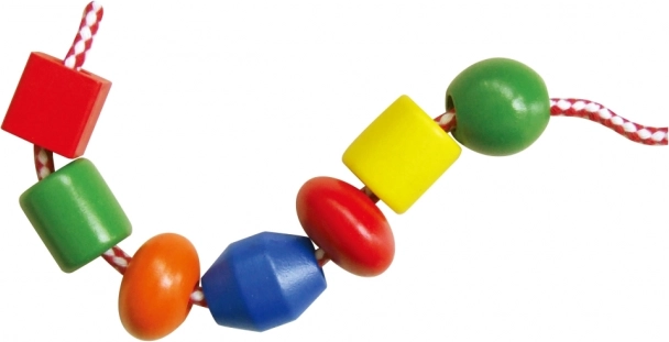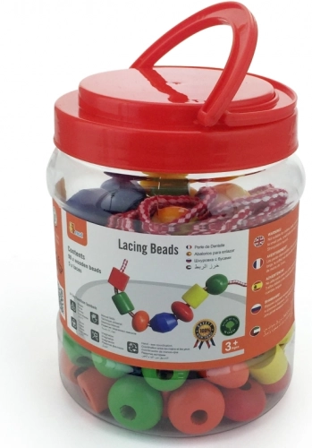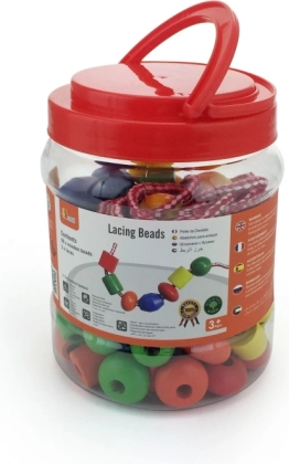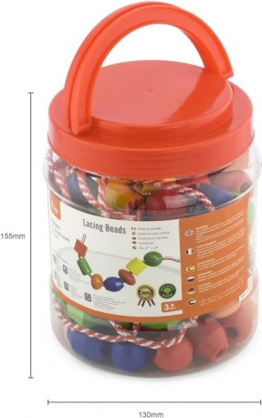Plastdåse indeholder store træperler og farvede snore, som perlerne kan trædes på. Perlestørrelse ca. 2 x 2 cm afhængigt af typen. Pakningsmål ca. 16 x 12 cm. Indeholder 90 perler og 5 snore. Alder 3+