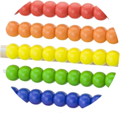 Ti rækker med tydeligt farvede perler understøtter visuel opfattelse, sortering og de første regneopgaver.