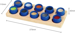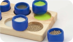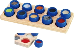 Barnets opgave er ud fra følelsen ved berøring at finde den tilsvarende tekstur og matche cylinderen til det rigtige hul – uden brug af synet. Dermed trænes taktil, vestibulær og proprioceptiv bearbejdning, som er afgørende i førskolealderen. Den robuste udførelse i træ sikrer holdbarhed og lang levetid.