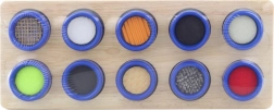 Dette taktile sorteringssæt i træ kombinerer populære sorteringsprincipper med dybere sensorisk stimulering. En plade med ti huller og et sæt på ti cylindre med forskellige overflader og materialer understøtter koncentration, logisk tænkning og udvikling af finmotorik.