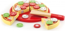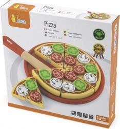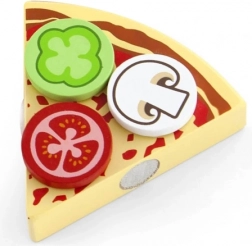 Sættet indeholder en pizza med en diameter på ca. 23 cm, en serveringsbakke og en spartel/kniv til realistisk udskæring. Med de aftagelige toppings træner børn greb og fantasi, mens forældre sætter pris på nem vedligeholdelse og træets lange levetid.