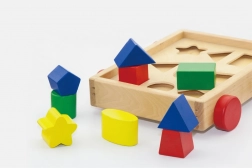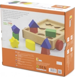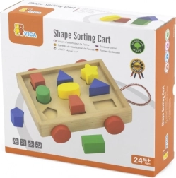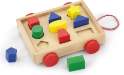 Træindsætning – vogn er et fremragende pædagogisk legetøj til børn fra 24 måneder, som hjælper med at udvikle genkendelse af former og hånd-øje-koordination.