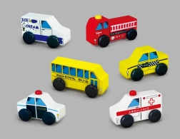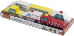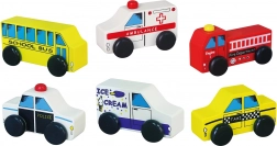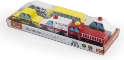 Børnesæt med træbiler tilbyder seks forskellige køretøjer til leg og læring. Perfekt til at udvikle fantasien og forståelsen af byens tjenester.