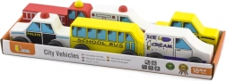 Sættet indeholder forskellige typer køretøjer, der hjælper børn med at udvikle kreativitet og forstå byens tjenester.