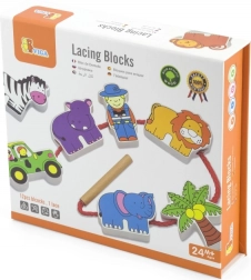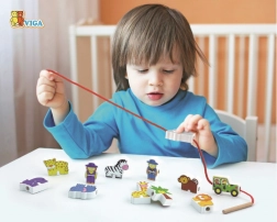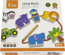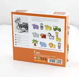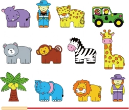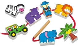 Sættet indeholder træklodser, der forestiller beboere fra safari, herunder leopard, palme, abe, flodhest, zebra, jeep, giraf, bjørn, løve, elefant og guide. Klodserne er omhyggeligt malet på begge sider med ugiftige farver og giver børn stor glæde ved leg. Alle elementer er designet til at støtte udviklingen af finmotorik og viden om dyrenes verden.