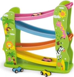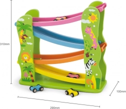 Denne smukt farvede træ-rutsjebane er perfekt til de mindste, der vil lege og samtidig udvikle deres evner. Den indeholder en rampe med flere niveauer i forskellige farver og lader små biler glide problemfrit ned ad banen.