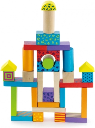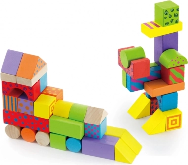 Forskellige former og farver motiverer børn til at bygge tårne, huse og fantasifulde konstruktioner og udvikler naturligt finmotorik og fantasi.