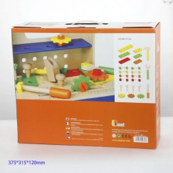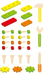 Alle komponenter er tilpasset små hænder og lavet af holdbart træ. Takket være det rige udvalg af skruer, møtrikker og plader opstår der uendelige kombinationsmuligheder, som udvikler fantasi og tålmodighed. Sættet er perfekt til selvstændig leg og fælles skabelse med forældre.