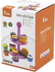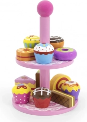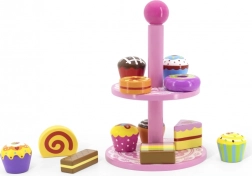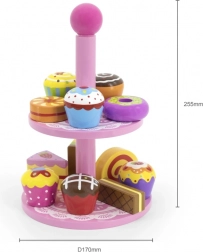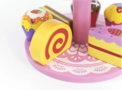 Dette stilfulde sæt med trædesserter på et todelt etagefad er ideelt til leg som café, teselskab eller børne-konditori. De veldesignede træstykker i livlige farver indbyder til udforskning og træner hånd-øje-koordination.