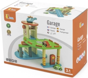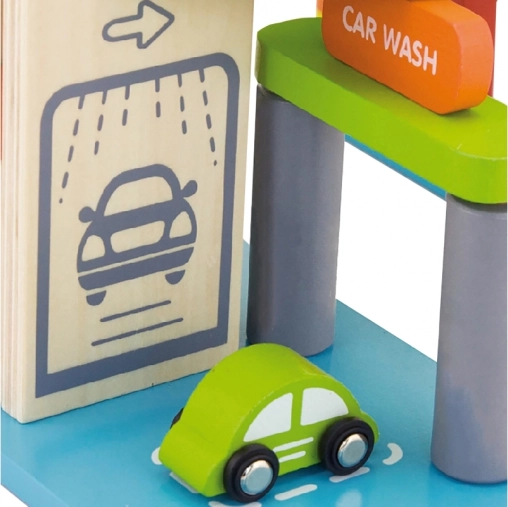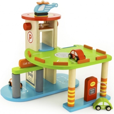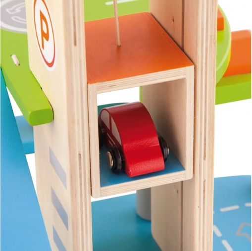 Denne kvalitets-trægarage tilbyder flere parkeringsniveauer, landingsplads til helikopteren og en praktisk elevator til nem flytning af bilerne mellem etagerne. Takket være det gennemtænkte design med baner, skilte og tilbehør træner børnene deres koordination og udvikler fantasien.