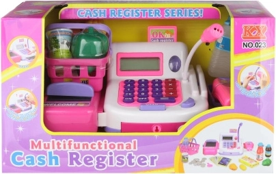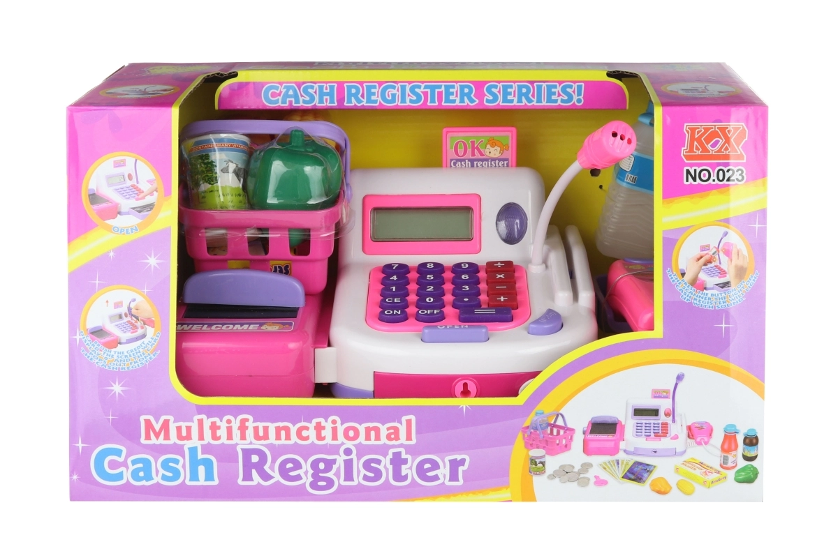 Kasseapparatet er udstyret med transportbånd, scanner og møntskuffe. Børn øver dermed grundlæggende regning, kommunikation og sociale færdigheder. Strømforsyning via 2× AA-batterier (medfølger ikke).