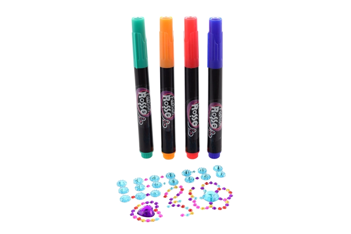 Fire farvede tuscher suppleret med selvklæbende sten giver tatoveringerne farve, dybde og en strålende glans.