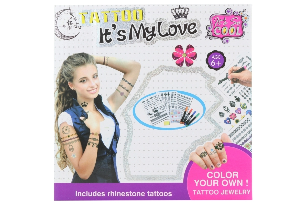 Opdag en verden af midlertidige tatoveringer og pynt, som du kan tilpasse præcis efter humør. Sættet byder på et rigt udvalg af motiver – fra elegante linjer og kæder til kroner, måner og ornamenter – samt farvede tuscher til at tegne detaljer. De glitrende sten giver hvert motiv en iøjnefaldende glans.