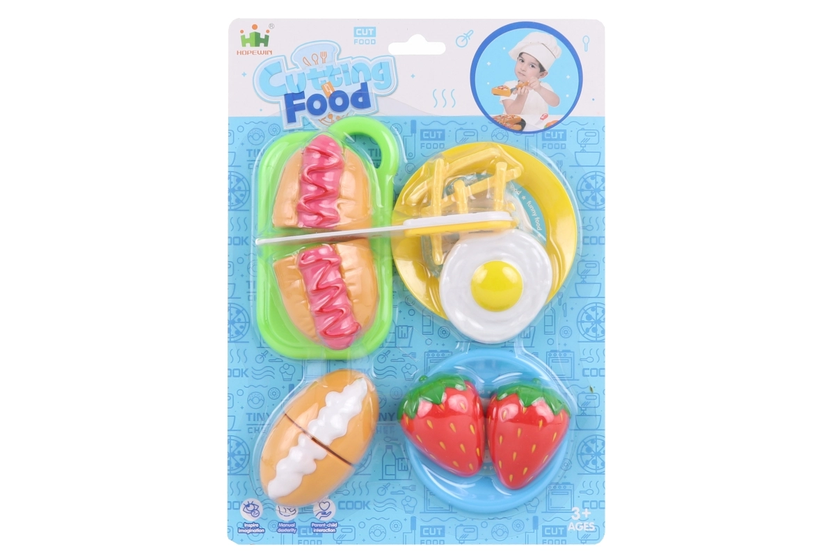 Sættet indeholder mange forskellige madvarer og køkkenredskaber, så børn kan lege madlavning, servering og betjening. Sættet er sikkert, farverigt og ideelt til fælles leg med forældre og søskende.