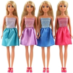 Hver dukke har en stilfuld kjole – lyserød, blå, lilla eller turkis. Perfekt til at samle og kombinere outfits.