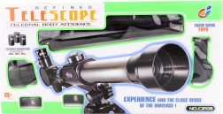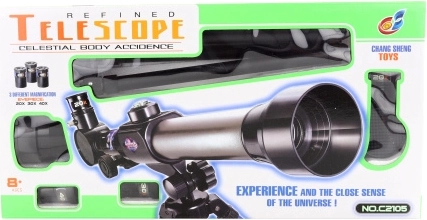 Plastteleskop med stativ. Objektivdiameter 60 mm, fokuseringsafstand 170 mm, forstørrelse 20x, 30x og 40x. Pakningsmål ca. 43 x 22 x 8 cm. Alder 8+