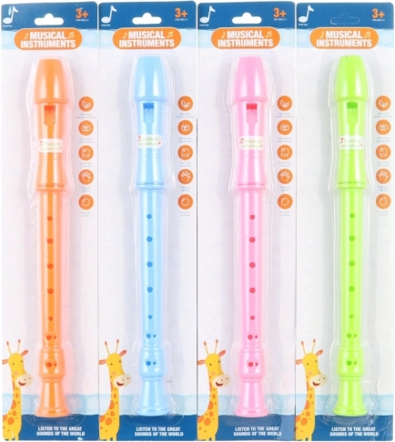 Plastblokfløjte 31,5 cm til børn fra 3 år. Let, holdbar og nem at betjene – ideel til de første musikalske skridt. Emballagemål 40×9×3 cm.