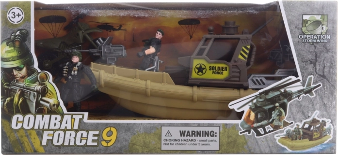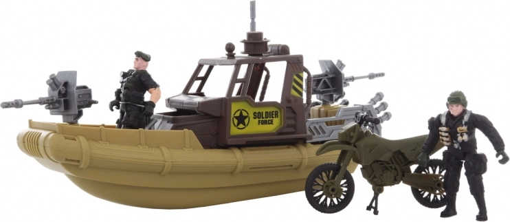 - Komplet udstyr – stor båd, motorcykel og 2 soldaterfigurer.