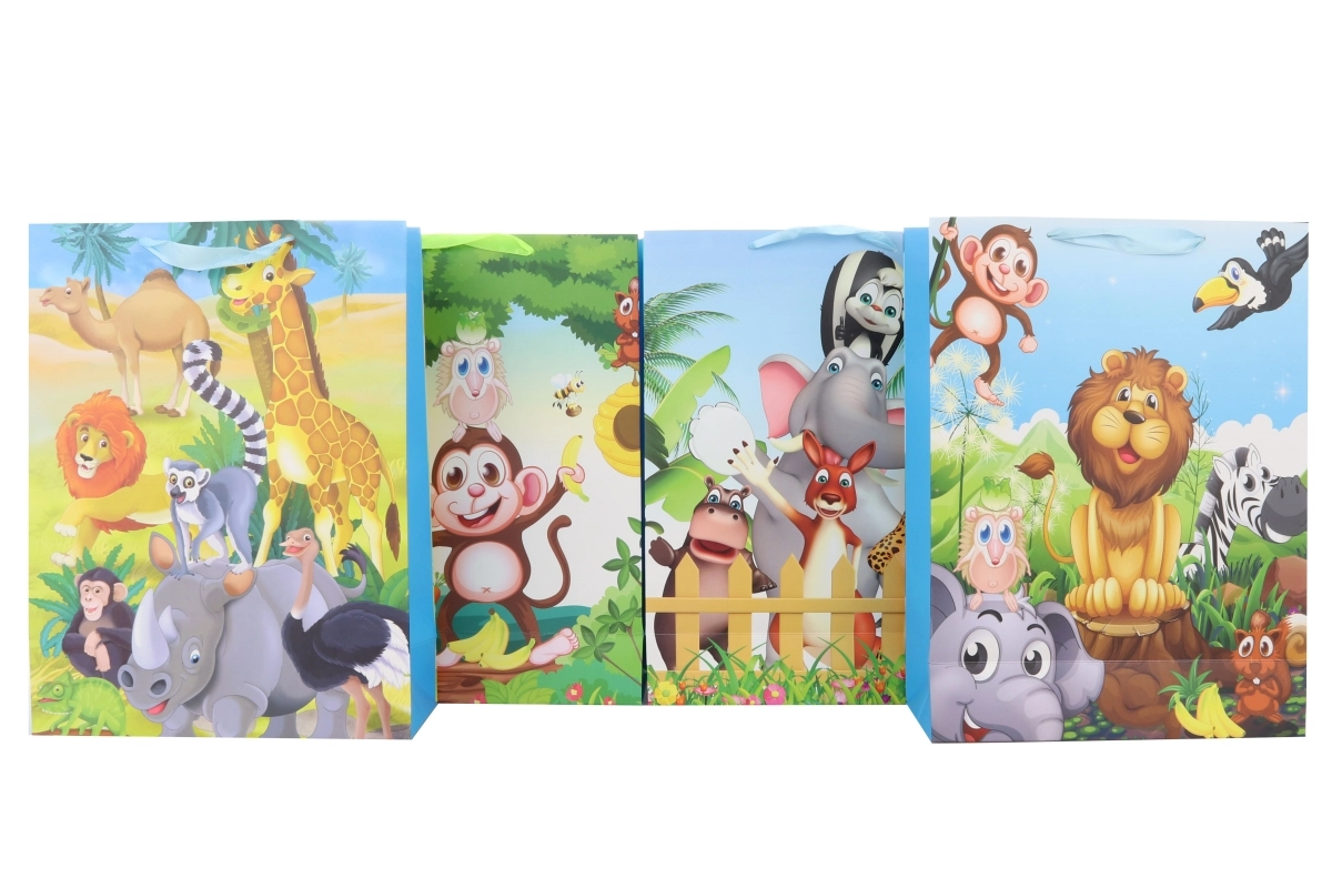 Den store gavepose med safari-motiver er ideel til indpakning af mere voluminøse gaver. De attraktive designs med eksotiske dyr giver gaven et unikt udseende og sparer tid ved indpakning. Posens udseende passer både til børn og voksne og egner sig til fødselsdage, fester og højtider.
