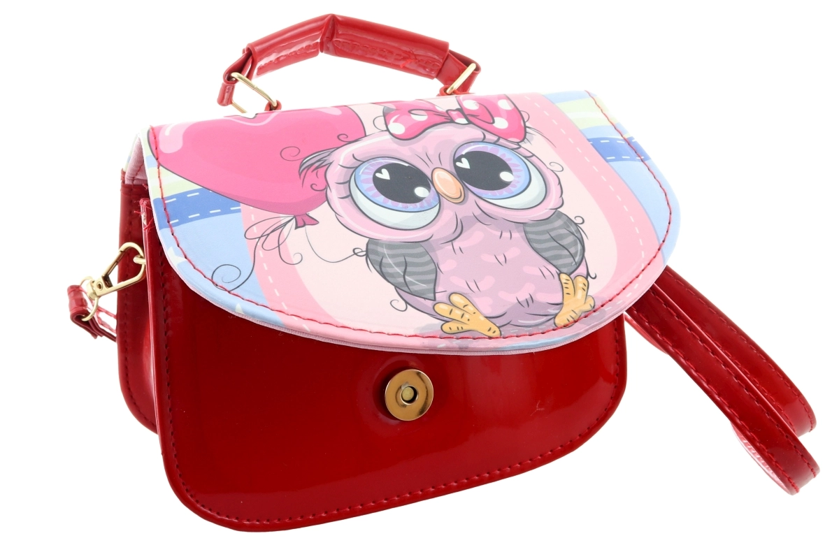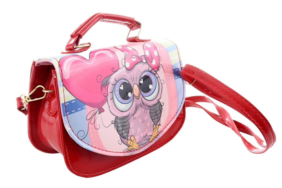 Denne elegante lille taske i rød farve imponerer med et sødt uglemotiv med sløjfe og hjerter. Den blanke overflade og de gyldne detaljer giver tasken et stilfuldt look, der passer til gåture, besøg og børnefødselsdage. Takket være de kompakte mål er den behagelig at bære, og der er plads til alle de små ting, børn gerne vil have med.
