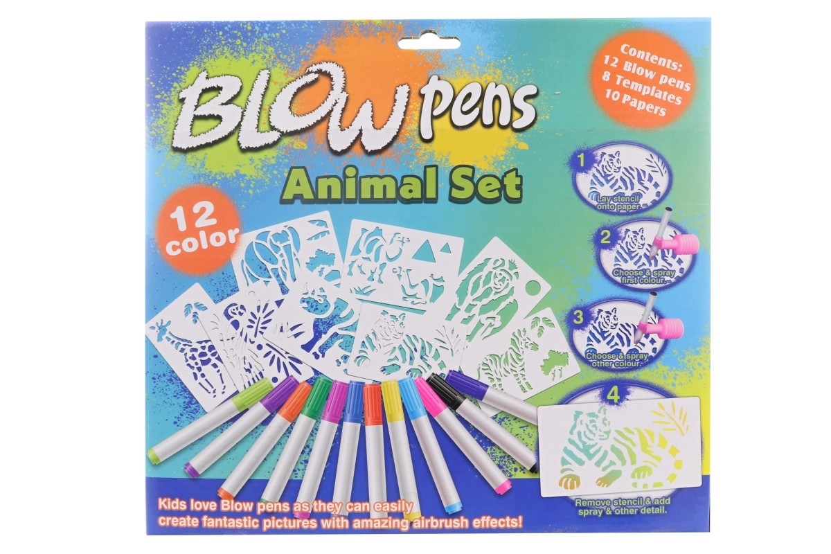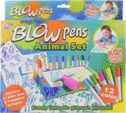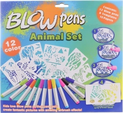 Med dette store sæt blæse-tuscher kan børn nemt skabe originale billeder med safari-dyr. Takket være mundstykket med pumpe kræves der ikke en stærk udånding – farven påføres i en blid strøm og skaber flotte overgange og skyggeeffekter. Den praktiske stand og holder holder tuscherne pænt organiseret samlet.