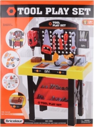 Stort plastarbejdsbord til små gør‑det‑selv‑folk med masser af tilbehør og realistiske funktioner. Indeholder bænkboremaskine, skruestik, høvl, sav, hammer, nøgler og andet tilbehør. Ideelt til udvikling af finmotorik, kreativ leg og sikker introduktion til værktøj.