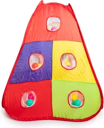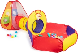 Forvandl børneværelset eller haven til en farverig legeplads. IPLAY legeteltet kombinerer telt, tunnel og tørt boldbassin til én stor legebane, der fremmer motorik, koordination og præcision. Børn kan sigte mod 5 farvede målskiver, øve kast i kurven og boltre sig trygt i et bassin fyldt med bolde.