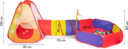 Det store sæt (ca. 300 × 120 × 100 cm) skaber et farverigt rum til at kravle, gemme sig og kaste bolde. Ideelt til søskende og venner.