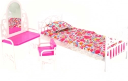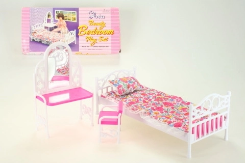 Oplev det charmerende Glorie-sæt, som bringer en dukkeseng med blødt sengetæppe og pude, et toiletbord med spejlfilm samt en praktisk stol. Passer perfekt til de fleste almindelige dukker og supplerer dukkernes værelse med et hyggeligt sted til både hvile og pynt.