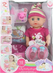 I pakken er alt, hvad små omsorgsgivere har brug for – fra sko og hagesmæk til flaske og tallerken. Dukken har kompakte mål 30 × 12 cm og ligger behageligt i små hænder. Med de medfølgende AG13-batterier er den klar til leg med det samme.