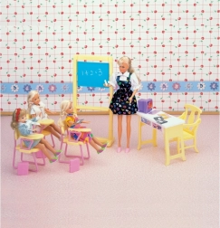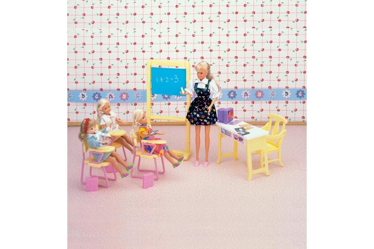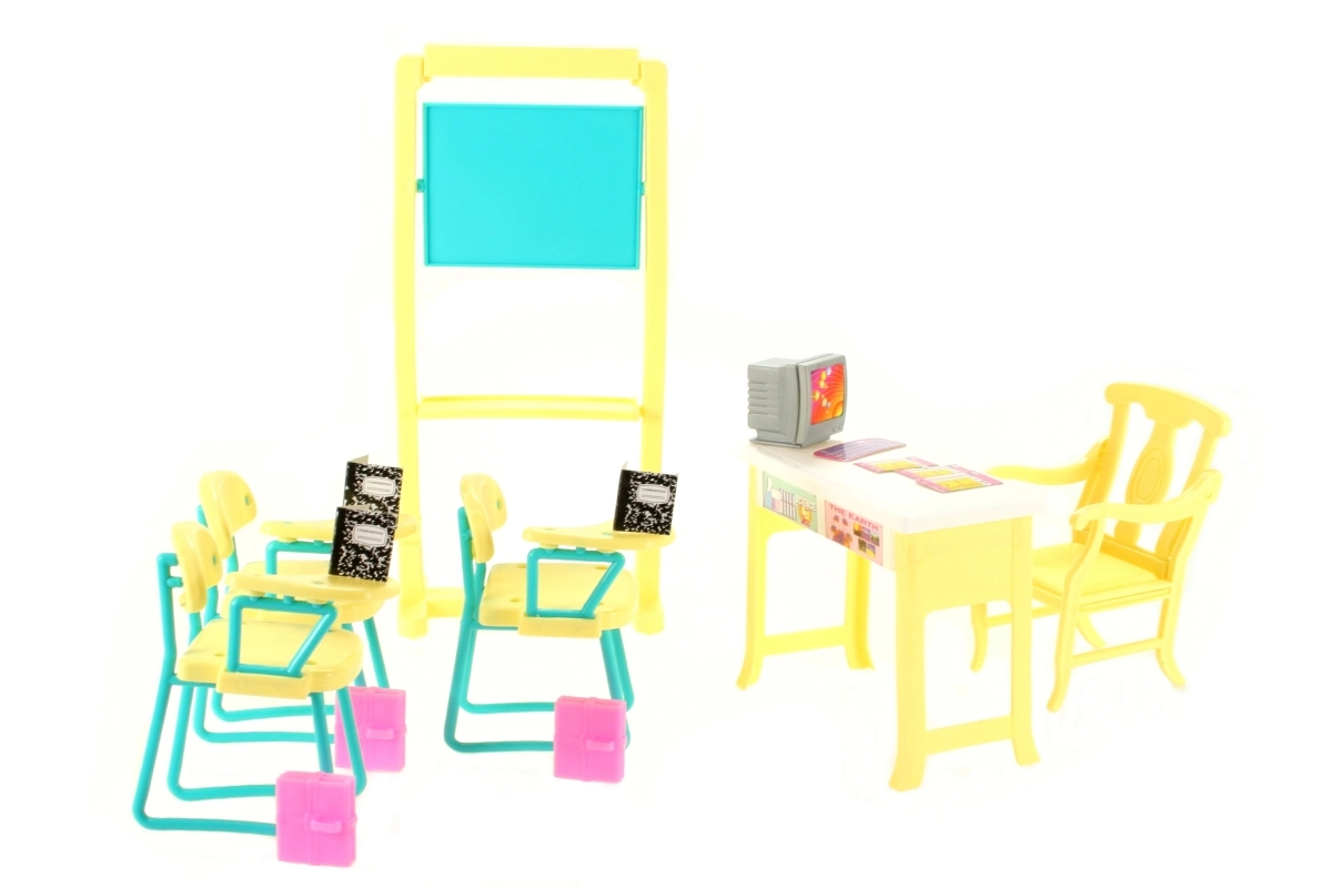 Pakken indeholder en rummelig tavle, lærerkrog med computer og stole til eleverne. Takket være de kompakte mål er sættet kompatibelt med almindelige dukker og let at opbevare.
