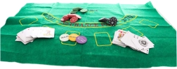 Sættet indeholder jetoner i forskellige farver og værdier, spillekort og en dealer-knap for en autentisk spilleoplevelse.