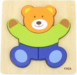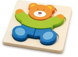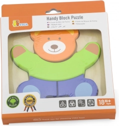 Puslespillet indeholder 4 brikker, der, når de er samlet på en træbund, danner et billede af en bjørn. Disse brikker passer perfekt i de skårne former, der er udformet præcist for optimal samling.