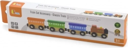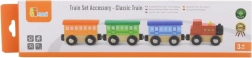 Træsættet Klassisk tog består af 4 dele, der er forbundet med magneter. Dette legetøj er designet af den anerkendte producent af trælegetøj, Viga Toys. Sættet kan bruges som et selvstændigt legetøj eller som tilbehør til andre togbaner, byggesæt og sæt.