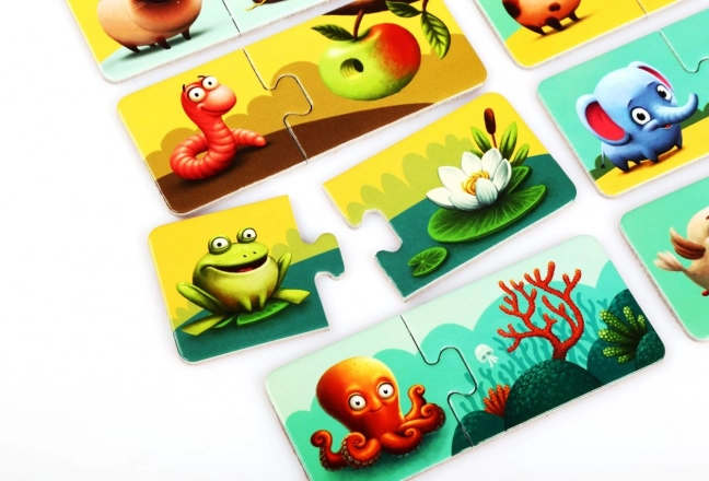 Sættet indeholder 20 robuste brikker, der danner 10 tematiske par. Illustrationerne er tydelige og farverige for at fastholde opmærksomheden og motivere til udforskning. Det kvalitetsmæssige, miljøvenlige karton med blank overflade er holdbart og kan tørres af med en fugtig klud.