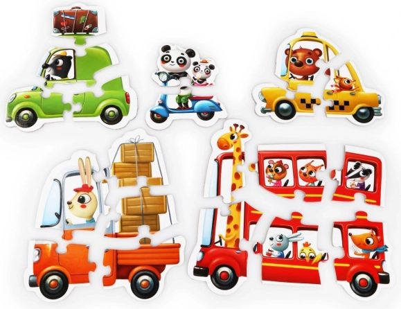 Saml fem farverige køretøjer med dyr. Hvert billede har 2–6 brikker og understøtter gradvis læring uden frustration.