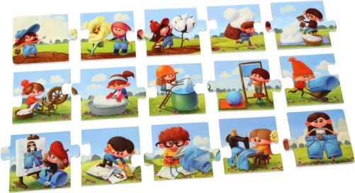 Fortælle-puslespillet Puzzlika Fremstilling af jeans giver børn fra 2 år læring gennem leg ved at samle historien – fra høst af bomuld til de færdige jeans. De store og robuste brikker er ideelle til små hænder, og de klare illustrationer hjælper med at forstå rækkefølgen af de enkelte trin.