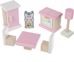 Træd ind i fantasiens verden med Træmøbler til dukker Køkken, et smukt sæt med 10 dele, der fører dine børn ind i en verden af endeløs kreativitet. Sættet indeholder: