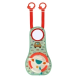 Sikkerhed er vores prioritet, derfor er legetøjet lavet med den største omhu uden skarpe kanter og løse dele. Det kan nemt fastgøres til nakkestøtten med justerbare plastikringe.