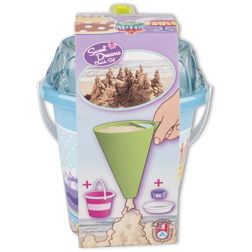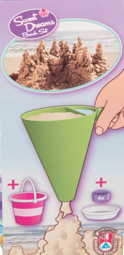 Oplev kreativ leg på stranden og i sandkassen med dette 8‑delede sæt fra Androni. Indeholder en spand, et gennemsigtigt sigte formet som en kage, en skovl, 4 forme og en dekorationstragt til at blande sand og vand. Fremstillet i Italien af kvalitetsplast, egnet fra 12 måneder.