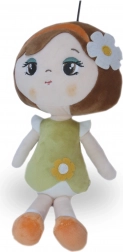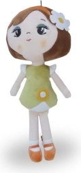 Plysdukken Roma fortryller med sit fine udseende – brunt hår med blomsterpynt, olivengrøn kjole med lille blomst og orange sko. Den blide, glatte og skinnende plys er behagelig at røre ved og indbyder til kram. Den lette konstruktion gør det nemt for børn at tage hende med overalt – i sengen, på tur eller på besøg.