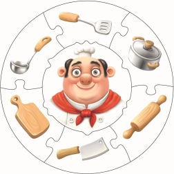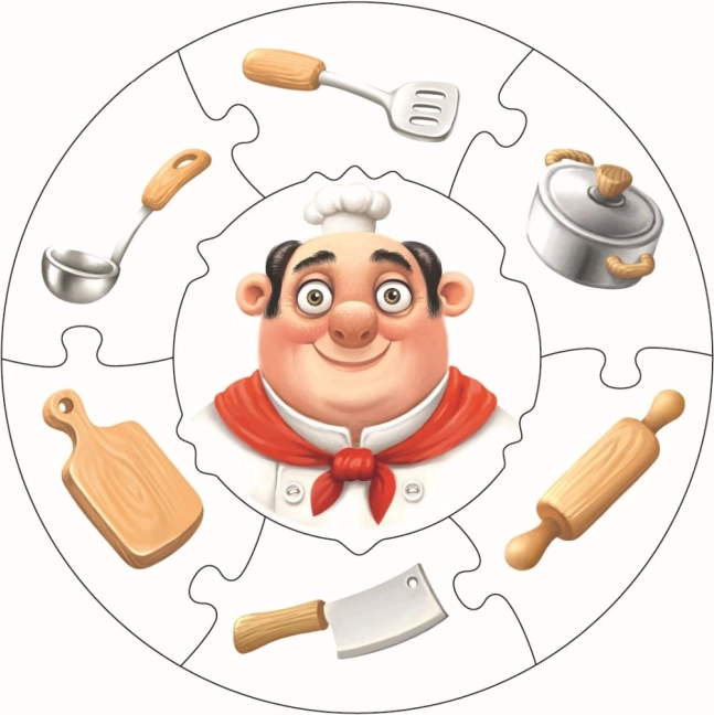 Illustration af en kok med redskaber (grydeske, gryde, kagerulle) hjælper med at udvikle logik og forståelse af daglige aktiviteter.